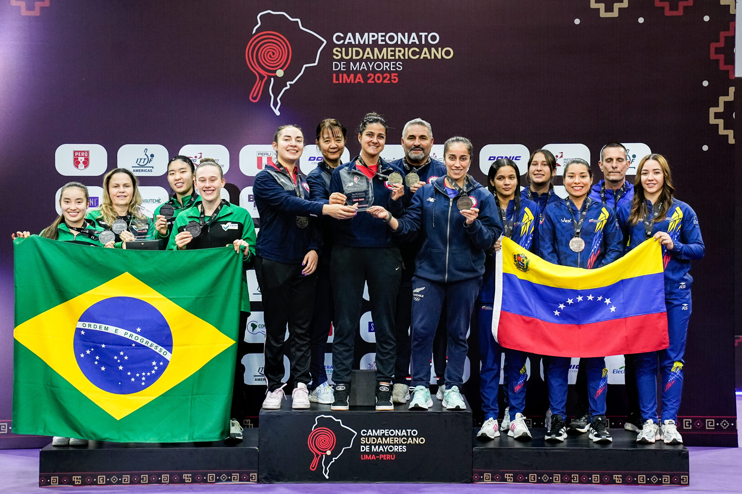 Este domingo, el Polideportivo N.º 3 de la Videna fue escenario de la ceremonia de premiación por equipos femenino y masculino del Campeonato Sudamericano de Mayores – Lima 2025, evento que reunió a las principales selecciones de tenis de mesa de la región.